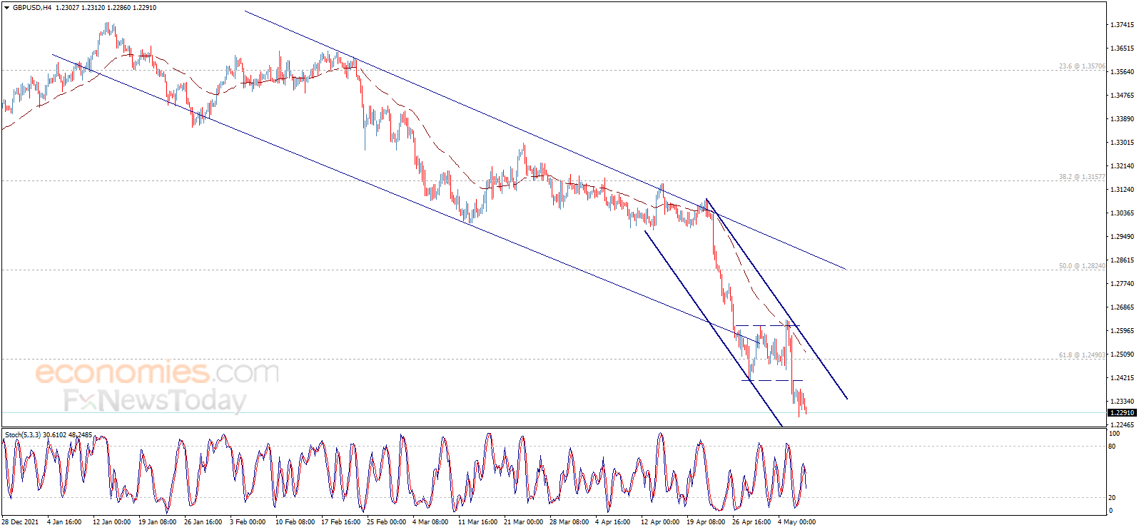 英镑/美元成功跌破1.2300,从而确认该货币对日内以及短期内延续看空走势。如图所示,英镑/美元在看空通道内波动。随机指标传递负面信号,等待该货币对跌向下一目标1.2200。