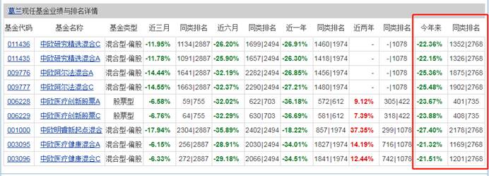 截止2022年5月4日,葛兰现任的基金共计9款(区分A C),今年以来的亏损幅度在21-28%之间,其中,亏损幅度最大的是中欧明睿新起点混合(-27.4%)。从同类排行来看,处于中等偏下水平。