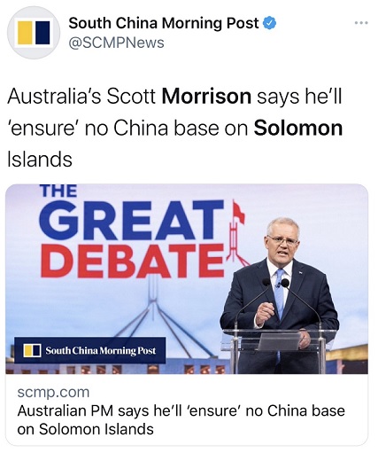 在5月21日澳大利亚大选之前,中国在太平洋地区日益增长的影响力已成为澳大利亚的一个热门政治问题。上月,北京方面宣布已与所罗门群岛签署了一项安全协议。