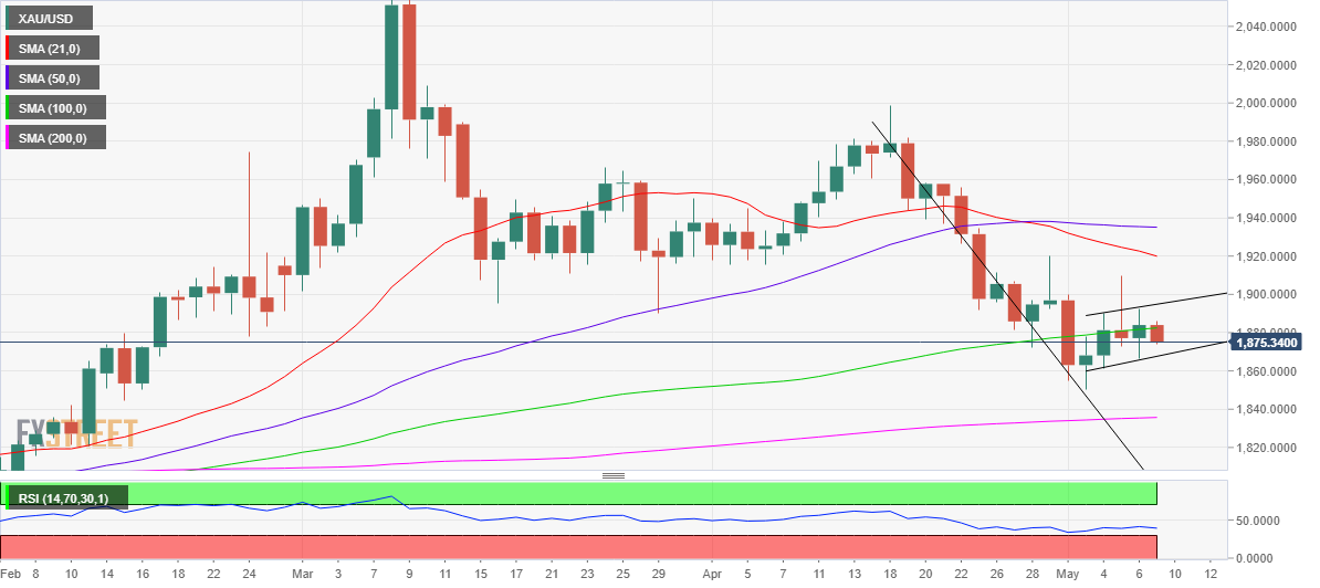 24K99讯 周一(5月9日)欧市早盘,现货黄金维持跌势,金价目前跌至1968.50美元/盎司附近。知名财经网站FXStreet分析师Dhwani Mehta周一最新撰文,对金价技术前景进行分析。Mehta指出,若金价日收盘低于1868美元/盎司,后市恐遭遇更大抛售。