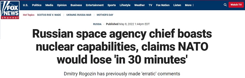 据福克斯新闻周日(5月8日)报道称,俄罗斯航天局(Roscosmos)局长、前副总理罗戈津(Dmitry Rogozin)周日表示,如果发生核战争,“北约国家将在半小时内被俄罗斯摧毁。”不过他也强调,这样的事件“不能被允许,因为其后果将影响(整个)地球。”