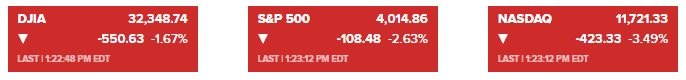 道琼斯指数下跌550点或近1.7%,标普500指数下跌2.6%,纳斯达克综合指数下跌近3.5%。