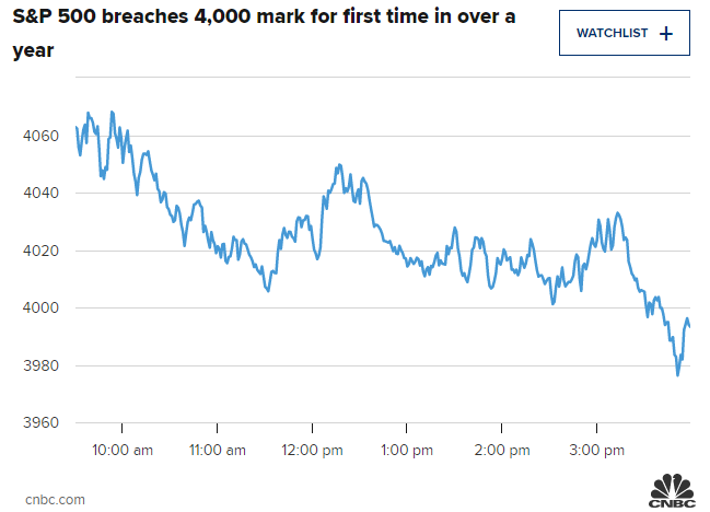 FX168财经报社(北美)讯 周一(5月9日),美股大幅下跌,随着市场抛售的继续,标普500指数一年多来首次跌破4000点大关。