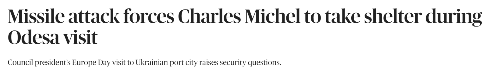 官员们拒绝提供进一步的细节,包括会议地点,米歇尔在地面时是否确实有导弹击中,或者空袭警报被证明是虚惊一场。乌克兰电报频道报道称,周一早上在敖德萨和敖德萨地区至少响起了两次空袭警报,从克里米亚发射的四枚俄罗斯“奥尼克斯”导弹于当地时间上午9点左右击中了敖德萨地区。
