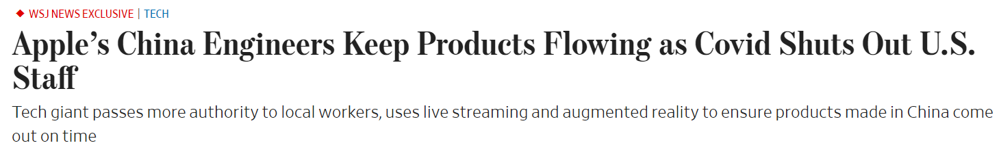 FX168财经报社(香港)讯 新冠疫情前,苹果公司每个月都会派数百名美国工程师前往中国,监督生产其大部分产品的代工厂。现如今情况有所转变,这家全球科技领头羊更多地依赖本地工程师。报道称,过去两年由于中国严格的边境管制,大多数美国本土的苹果公司工程师都被挡在了中国的门外,边境控制是为防止新冠病毒输入。