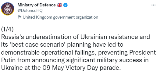 英国国防部表示,俄罗斯低估了乌克兰的抵抗力及其“最佳情况”计划,导致明显的行动失败,阻止普京总统在5月9日胜利日阅兵式上宣布在乌克兰取得重大军事成功。根据英国最新的情报报告,俄罗斯的入侵计划极有可能是基于一个错误的假设,即它会遇到有限的抵抗,并且能够迅速包围和绕过人口中心。