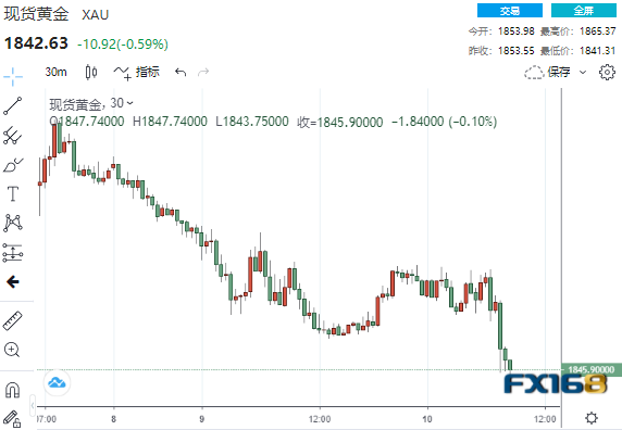 美市盘中,现货黄金短线迅速下跌并刷新日低至1841.31美元/盎司,较日高回落24美元。