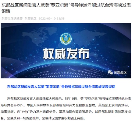 据解放军“东部战区”公众号5月10日深夜消息,东部战区新闻发言人施毅陆军大校表示,5月10日,美“罗亚尔港”号导弹巡洋舰过航台湾海峡并公开炒作。中国人民解放军东部战区组织兵力全程跟监警戒。美频频上演此类戏码、滋事挑衅,向“台独”势力发出错误信号,蓄意加剧台海紧张局势。