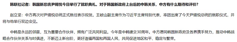 赵立坚表示,中方再次对尹锡悦总统正式就任表示祝贺。王岐山副主席作为习近平主席特别代表,率团出席了今天尹锡悦总统的就职仪式,并将与他举行双边会见。