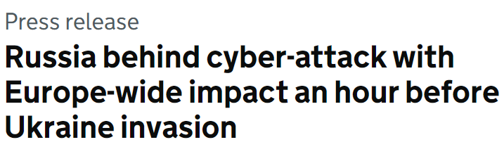 英国、美国、欧盟及其盟友在5月10日共同宣布,在2月全面入侵前,俄罗斯对乌克兰发动一系列网路攻击,其中对Viasat的攻击影响范围较大,数以万计网路终端遭破坏至无法修复的程度。