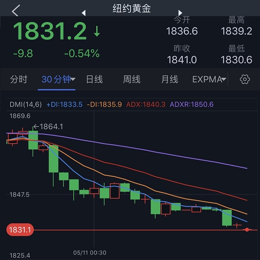 24K99讯 因美元保持强势,纽约黄金期货价格周二(5月10日)收于三个月来的最低水平。周三亚市早盘,因中美贸易最新消息令市场风险偏好情绪升温,黄金期货进一步大跌,目前逼近1830美元/盎司。投资者正在等待美国通胀数据,寻找和美联储货币政策有关的蛛丝马迹。