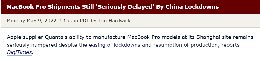 FX168财经报社(香港)讯 中国受疫情影响实施封城政策,据外媒Macrumors引述DigiTimes报道所称,尽管半导体各家代工厂陆续恢复生产,但广达上海厂MacBook Pro产能仍受到严重阻碍。台湾供应链网站数据显示,该厂迄今仅恢复约30%产能,同时也影响MacBook Pro的交货时间,最快也需要拖至6月底才能交货。