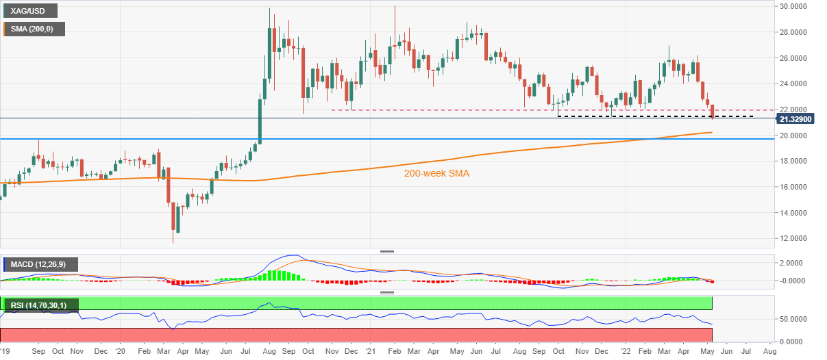 Panchal写道,在跌破2021年10月以来的水平支撑位后,银价周二重挫跌至2020年6月以来的最低水平。随着RSI和MACD指标传递负面信号,加之银价跌破支撑位,银价可能会进一步下跌。20.20美元/盎司附近的200周移动平均线水平似乎是白银空头的短期目标。