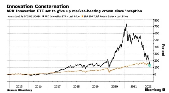 规模为79亿美元的ARK创新基金(ARK Innovation Fund)周二上涨2%,但今年迄今已累计下跌57.6%。总体而言,该基金目前较2021年2月的历史高点下跌了近75%,接近2020年3月新冠疫情大流行开始时触及的34.69美元的低点。
