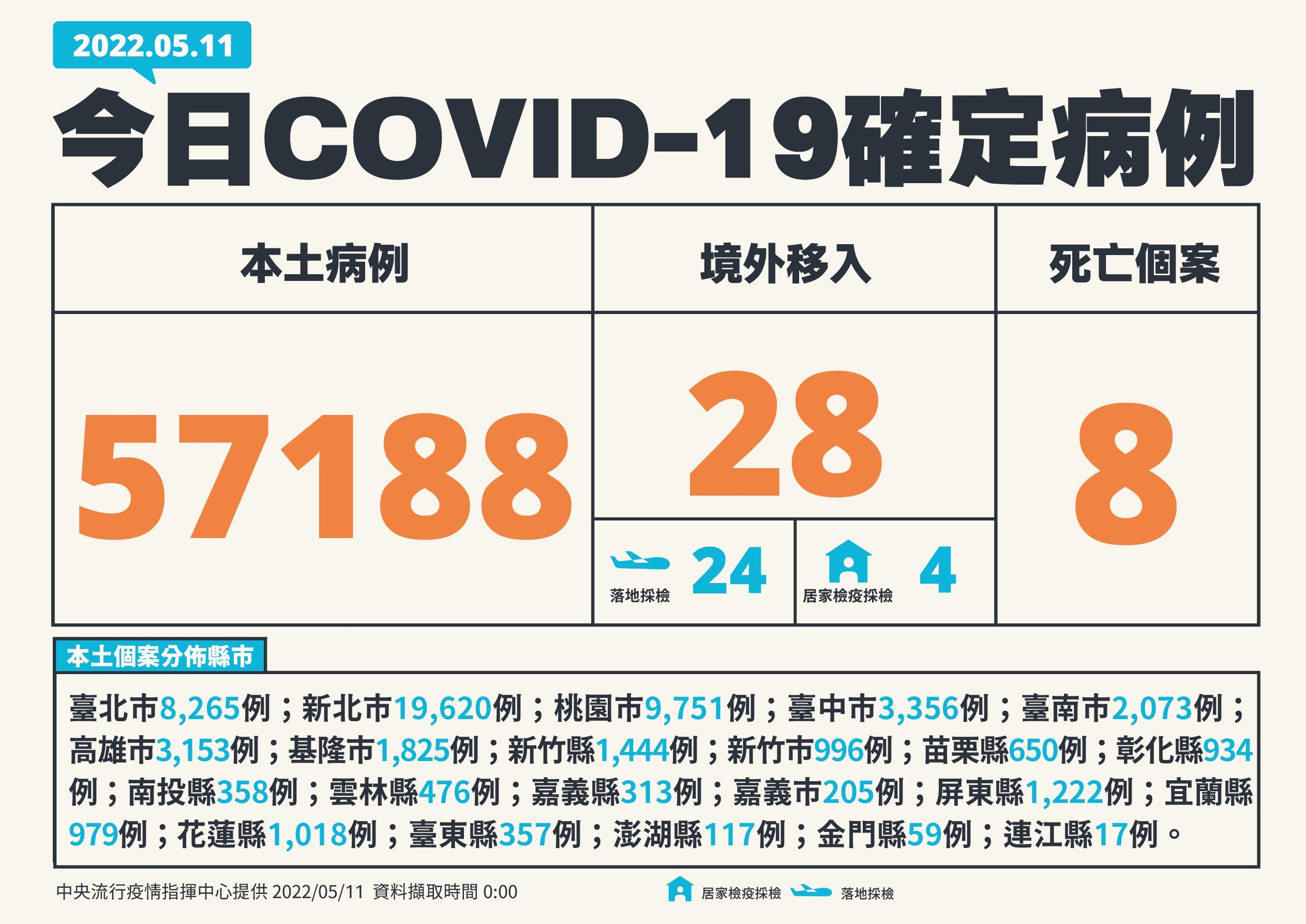 另新闻稿指出,11日新增8例本土病例死亡个案,为2例男性、6例女性,年龄介于60多岁至90岁以上,皆属重度感染个案、6例具慢性病史、5例无疫苗接种。确诊日介于2022年4月30日至5月9日,死亡日期介于5月2日至5月8日。