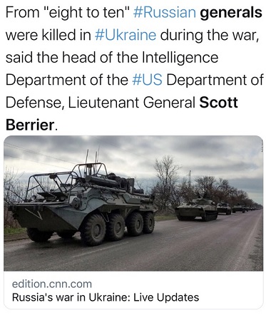 美国有线电视新闻网(CNN)报道称,俄军将领死亡数字对于现代军队体系来说,死亡率高得异常,已远超美军在阿富汗20年期间阵亡的将领数量。