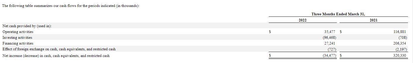 从经营现金流来看,净流入3547.7万美元,与利润表的差异主要在于Stock-based compensation,2022Q1的Stock-based compensation是1.49323亿美元。