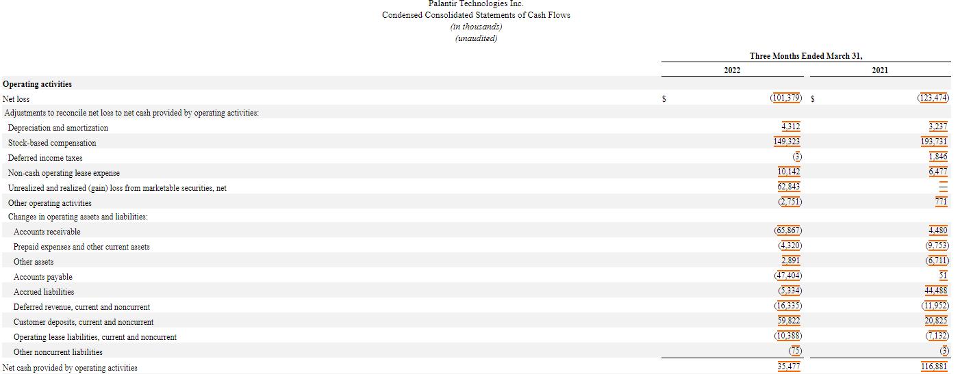 从财报来看,正如我们在2021年财报点评中所分析的那样,Palantir保持稳定的增长速度,同时,运营亏损持续收窄,运营现金流保持正向流入。同时公司在投资方面加大力度。