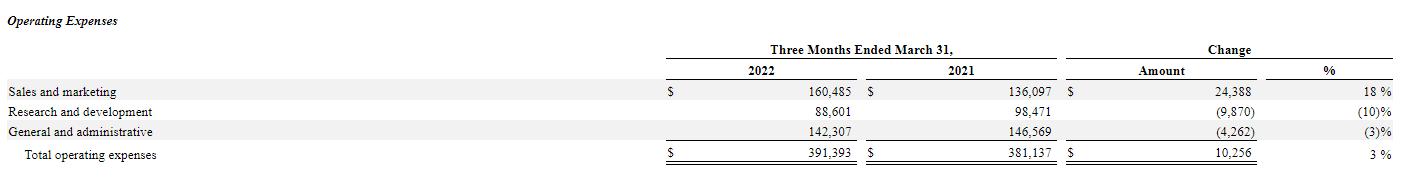 从运营费用来看,2022Q1运营费用3.93亿美元,同比增长3%;其中,销售营销费用同比增长18%,研发费用同比下降10%,管理费用同比下降3%。