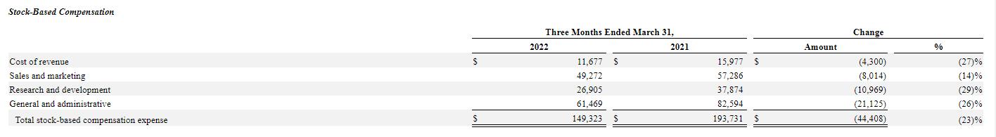 从数据变化来看,2022Q1的Stock-based compensation同比下降23%。