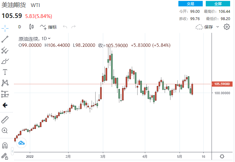 截至发稿,美国WTI原油期货上行6.55美元,涨幅6.62%,现报105.57美元/桶;布伦特原油期货上探5.94美元,涨幅5.85%,报107.45美元/桶。