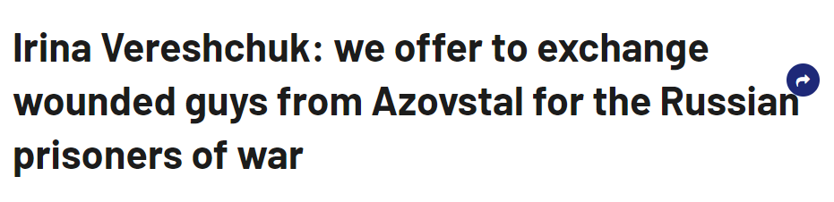 德新社引述乌克兰网路媒体《乌克兰真理报》(Ukrayinska Pravda)在11日报道,韦列舒克透露,乌克兰已经提议以马里乌波尔亚速钢铁厂内的重伤乌克兰士兵,交换俄罗斯战俘。她说:“我们向俄罗斯人提供了以下交流,第一步是我们将重伤的士兵们从亚速钢铁厂,送到人道主义走廊。同一时间,乌克兰军方将根据交换的标准规则,释放俄罗斯战俘。”