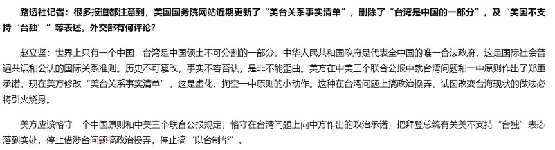 朱凤莲回应称,岛内一些人炒作美国务院网站修改涉台内容,企图“倚美谋独”,改变不了台湾是中国一部分的事实。我们敦促美国政府停止任何虚化掏空一个中国原则的行径,以实际行动恪守一个中国原则和中美三个联合公报规定。