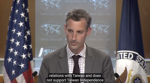 普莱斯在例行记者会上说:“我想强调的是,我们不支持‘台独’,仍然坚持‘一个中国’政策。”普莱斯强调,华盛顿的对台政策”没有改变”。