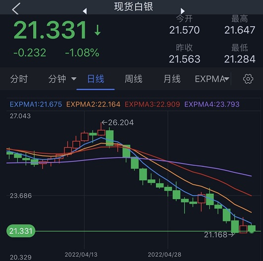 银价近期持续下滑,周二最低一度触及21.17美元/盎司。周三银价止住连续四个交易日下滑的态势。但随着美元走强,银价周四恢复跌势。