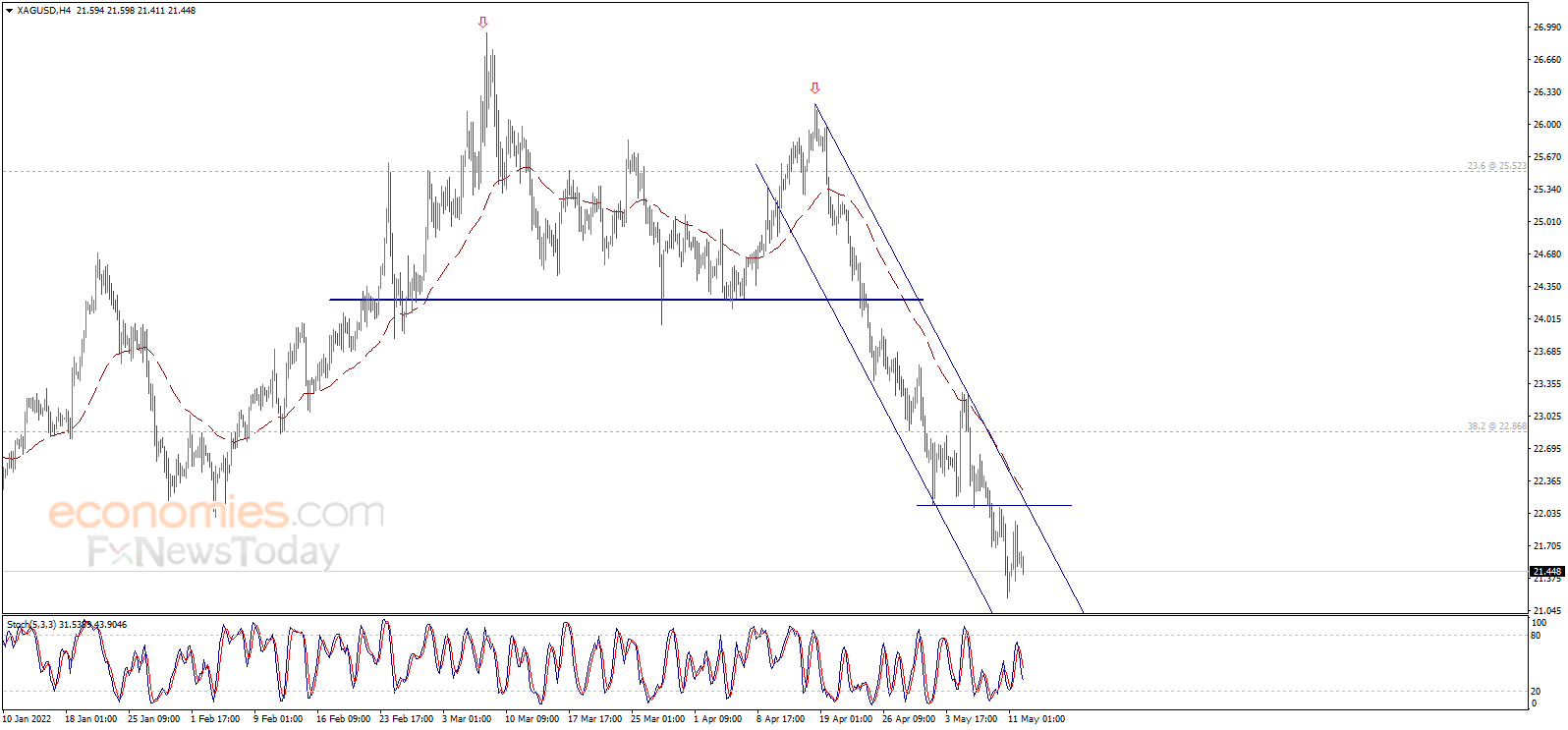 Economies.com在文章中写道,银价昨日上涨后再度回落,银价恢复主要看空趋势。如图所示,银价在看空通道内波动,看空目标瞄准20.75美元/盎司。