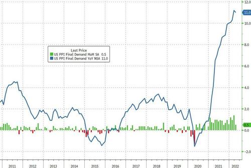 数据显示,美国4月PPI月率录得0.5%,为2021年9月以来最小增幅;年率为11%,高于预期的10.7%。