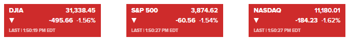 道琼斯指数下跌近500点或超1.5%,盘中一度上涨逾80点;标普500指数下跌超1.5%;纳斯达克综合指数下跌1.6%,此前一度上涨1.6%。