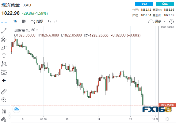 随着美元上扬,现货黄金持续下跌并刷新日低至1822.05美元,较日高已大幅回落36美元。