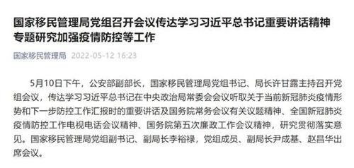 据国家移民管理局微信公众号消息,5月10日下午,国家移民管理局党组召开会议专题研究加强疫情防控等工作,会议要求,要严格执行从严从紧的出入境政策,从严限制中国公民非必要出境活动,严格出入境证件审批签发。