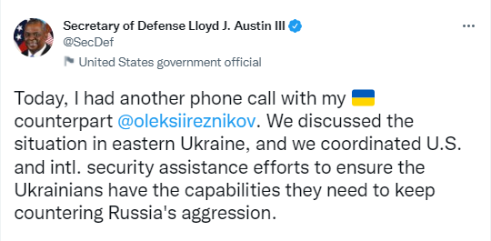 美国国防部长奥斯丁(Lloyd Austin)的最新消息称,他与乌克兰国防部长奥列克西·雷兹尼科夫(Oleksiy Reznikov)通了电话。奥斯丁在推特写道:“我们讨论了乌克兰东部的局势,我们协调了美国和国际。安全援助努力,以确保乌克兰人有能力继续对抗俄罗斯的侵略。”