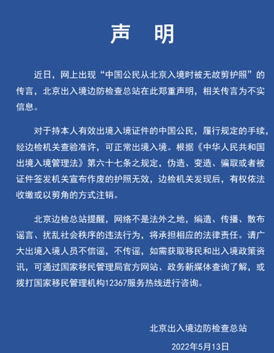 针对近日网上出现的“中国公民从北京入境时被无故剪护照”的传言,北京出入境边防检查总站5月13日发表声明称,相关传言为不实信息。