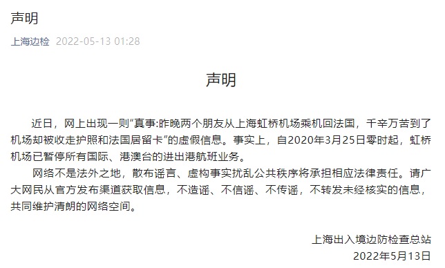 近日,网上出现一则“真事:昨晚两个朋友从上海虹桥机场乘机回法国,千辛万苦到了机场却被收走护照和法国居留卡”的虚假信息。事实上,自2020年3月25日零时起,虹桥机场已暂停所有国际、港澳台的进出港航班业务。