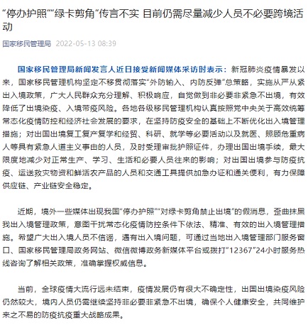 国家移民管理局指出,近期,境外一些媒体出现中国“停办护照”“对绿卡剪角禁止出境”的假消息,歪曲抹黑我出入境管理政策,意图干扰常态化疫情防控条件下依法、精准、有效的出入境管理措施。希望广大出入境人员不信谣,遇有出入境问题,可通过当地出入境管理部门服务窗口、国家移民管理局政务网站、微信微博政务新媒体平台或拨打“12367”24小时服务热线咨询了解相关政策,准确掌握权威信息。