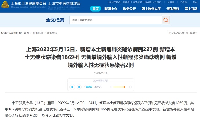 上海市卫健委副主任赵丹丹表示,5月12日,上海新增227例新冠肺炎本土确诊病例和1869例本土无症状感染者;新增本土死亡病例2例,分别为88岁、89岁的老年患者,均未接种新冠疫苗,死亡的直接原因均为基础疾病。