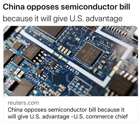 雷蒙多说:“我一点也不惊讶。中国不希望我们通过这个法案。他们知道这项法案将使我们在竞争中胜过他们。他们最不希望看到的就是我们投资520亿美元。”