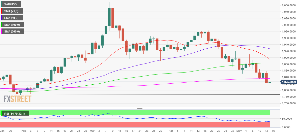 24K99讯 周五(5月13日)欧市盘中,美元指数短线显著走高,目前回到104.80附近。现货黄金小幅反弹,现报1824美元/盎司附近。知名财经网站FXStreet分析师Dhwani Mehta周五最新撰文,对金价技术前景进行分析。Mehta指出,尽管金价反弹,但只要低于200日移动均线,那么金价仍未摆脱困境。