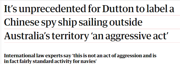 与此同时,澳大利亚国防部长达顿(Peter Dutton)称中国间谍船在西澳大利亚海岸的存在是“一种侵略行为”,但他的部门在评估中要清醒得多,国际法专家对这一说法泼了冷水。