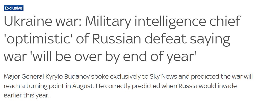 据乌克兰军事情报负责人Kyrylo Budanov少将所说:“俄乌战争突破点将在8月下旬,大部分现役作战行动将在今年年底前完成。因此,我们将在我们失去的所有领土上恢复乌克兰的权力,包括顿巴斯和克里米亚。”