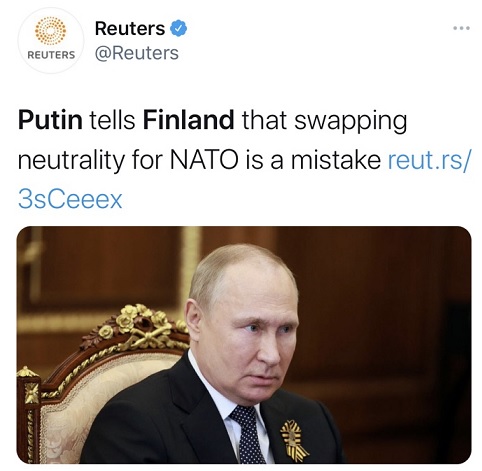 5月12日,芬兰总统和总理发表联合声明,宣布支持芬兰加入北约。对此,俄方回应道,俄罗斯“肯定”会将芬兰的北约成员国视为一种威胁,将被迫采取相应手段,以解决由此产生的安全威胁。