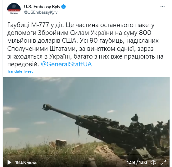 大使馆在推特发文:“M-777榴弹砲正在运作,这是美国最近为乌克兰武装部队提供的8亿美元援助计划的一部分。美国运送的90枚榴弹砲中,除了1枚之外,所有榴弹砲现在都在乌克兰,其中许多已在前线完成部署。”