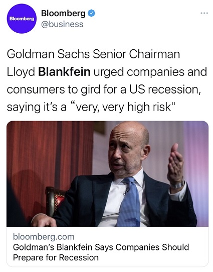 Blankfein在哥伦比亚广播公司(CBS)的“面对全国”(Face the Nation)节目中说,经济衰退是“一个非常、非常高的风险因素”。