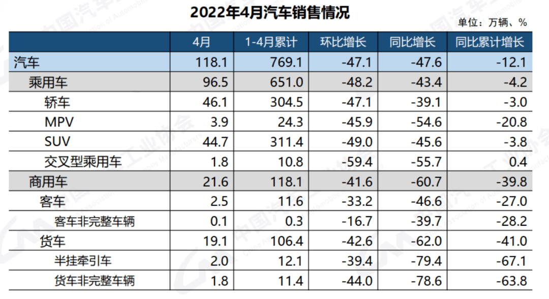 此前,中国汽车工业协会发布4月汽车工业产销数据。数据显示,2022年4月,汽车产销分别达到120.5万辆和118.1万辆,环比下降46.2%和47.1%,同比下降46.1%和47.6%,为十年来同期月度最低;1-4月,汽车产销769万辆和769.1万辆,同比下降10.5%和12.1%,结束了1-3月增长态势。