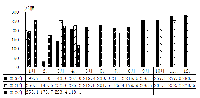 从2020年、2021年、2022年汽车月度销量对比可以看出,2022年4月的汽车销量不但低于2021年同期的225.2万辆;还低于2020年同期的207万辆,近乎一半的降幅。汽车行业在4月份经受的市场困境,由此可见一斑。