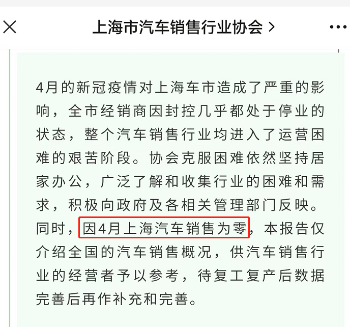 FX168财经报社(北美)讯 上海市汽车销售行业协会发文表示,4月的新冠疫情对上海车市造成了严重的影响,全市经销商因封控几乎都处于停业的状态,整个汽车销售行业均进入了运营困难的艰苦阶段,全月汽车实际销售基本为零。