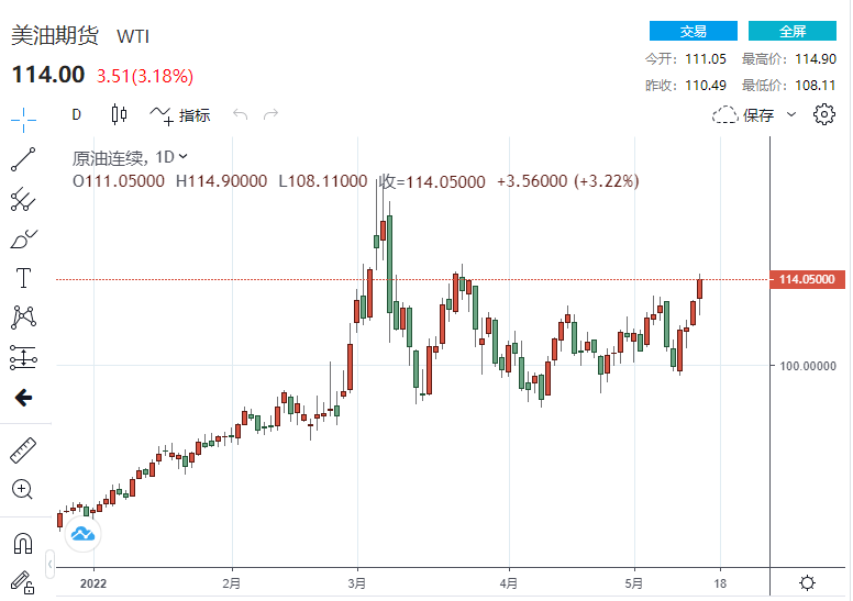 截至发稿,美国WTI原油期货上行3.96美元,涨幅3.60%,现报114.06美元/桶;布伦特原油期货上探2.72美元,涨幅2.45%,报113.88美元/桶。